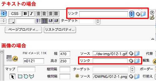 もしくは「プロパティウィンドウ」のリンクの空欄にリンク先を入れていきます。