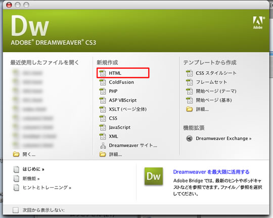 Dreamweaver CS3を起動すると「[ようこそ]画面」というウィンドウが開きます。