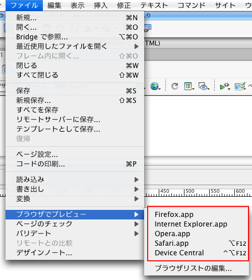 - メニュー「ファイル」>「ブラウザでプレビュー」で「Device Central」を選択する