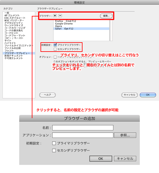 Dreamweaverでは、プレビューするブラウザーを追加することができます。