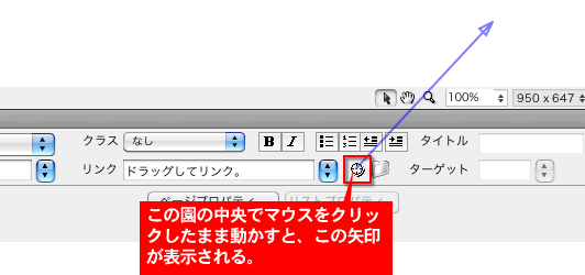 「プロパティ」パネルの「リンク」に直接アドレスやファイル名を入力してもいいですが、同じサイト内のHTMLファイルであれば、以下の方法でリンクを設定することができます。
