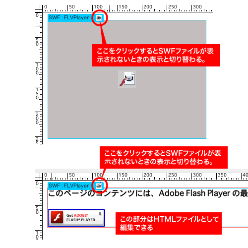 FLVファイルは、SWFファイルの調整と同様に、Flash playerがないと表示されません。FLVファイルが再生できないときのために、表示できないときのページも必要に応じて作成してください。