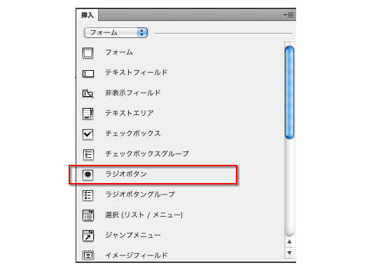 - 「挿入」パネルを「フォーム」から「ラジオボタングループ」を選択する。