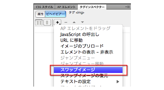 - 画像を選択したまま、「ビヘイビアー」パネルの「+」をクリックし、一覧の中から「スワップイメージ」を選択します。